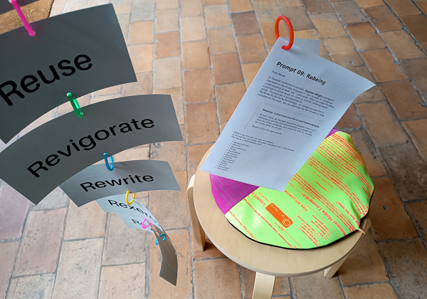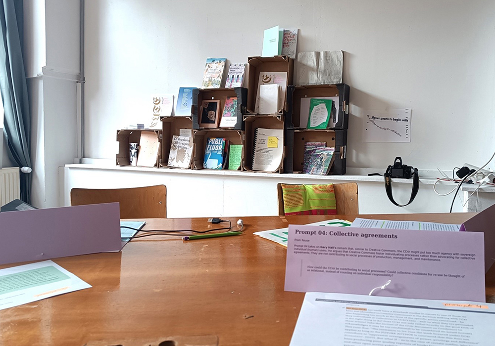 The space and the exhibition were designed in collaboration with artist Flo*Souad Benaddi and included a series of prompts by Erri Ammonita, Bye Bye Binary, Séverine Dusollier, Andrea Francke, Gary Hall, Jennifer Hayashida, Cathryn Klasto, Nkule Mabaso, Nicolas Malevé, Dubravka Sekulić, Winnie Soon, Christopher Ba Thi Nguyen, Marloes de Valk and Stephen Wright. We also included a collection of cases that showed the complexities of reuse, and a library of materials published under the “Collective Conditions for Reuse (CC4r)”, in collaboration with Constant. Flo*Souad Benaddi, Clara Bougon, Castillo, Sarah Magnan, Chae Kim, Cathryn Klasto, Gerrie van Noord, Femke Snelting, Litó Walkey and Eva Weinmayr took part in the work session.