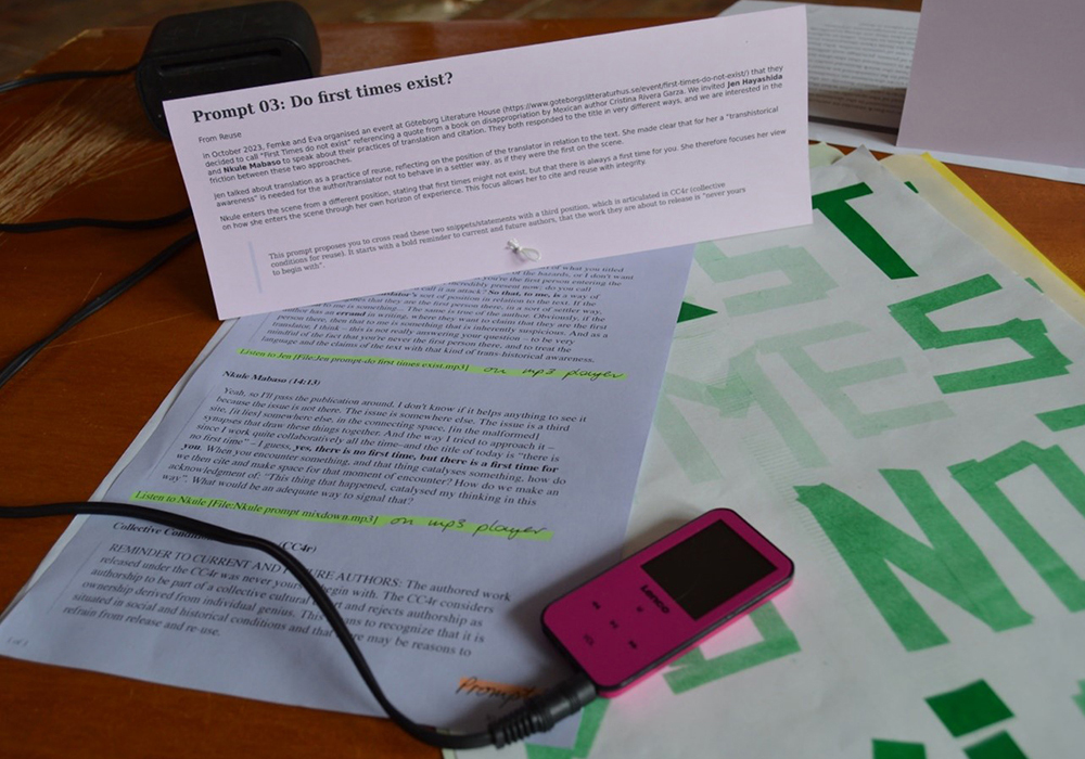 “First Times Do Not Exist: Translating and citing as relational practices of re-use” was an event that took place at Göteborgs Litteraturhus in 2023. In conversation with translator Jennifer Hayashida, curator Nkule Mabaso and theoretician Cathryn Klasto, the convenors Eva Weinmayr and Femke Snelting attempted to rethink translation and citation as dispersed economies of reuse. We proposed that feeding, digesting, excreting, negotiating and transforming, citation and translation are knowledge ecologies in which authorship is distributed, because a multiplicity of agents is at work to create a nutrient-rich milieu. The title is a quote from Cristina Rivera Garza. The Restless Dead: Necrowriting and Disappropriation. Nashville: Vanderbilt University Press. 2020. p. 50.